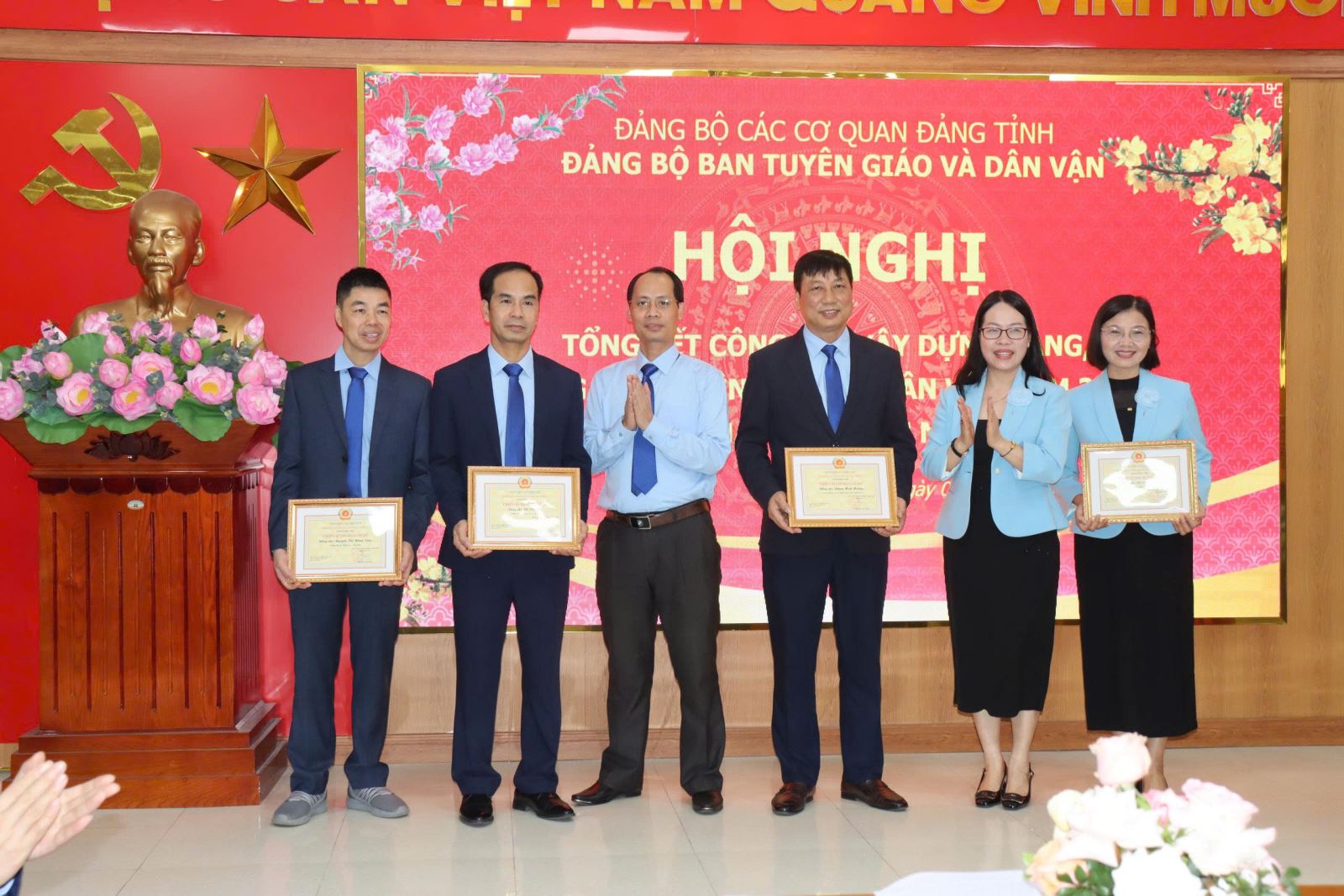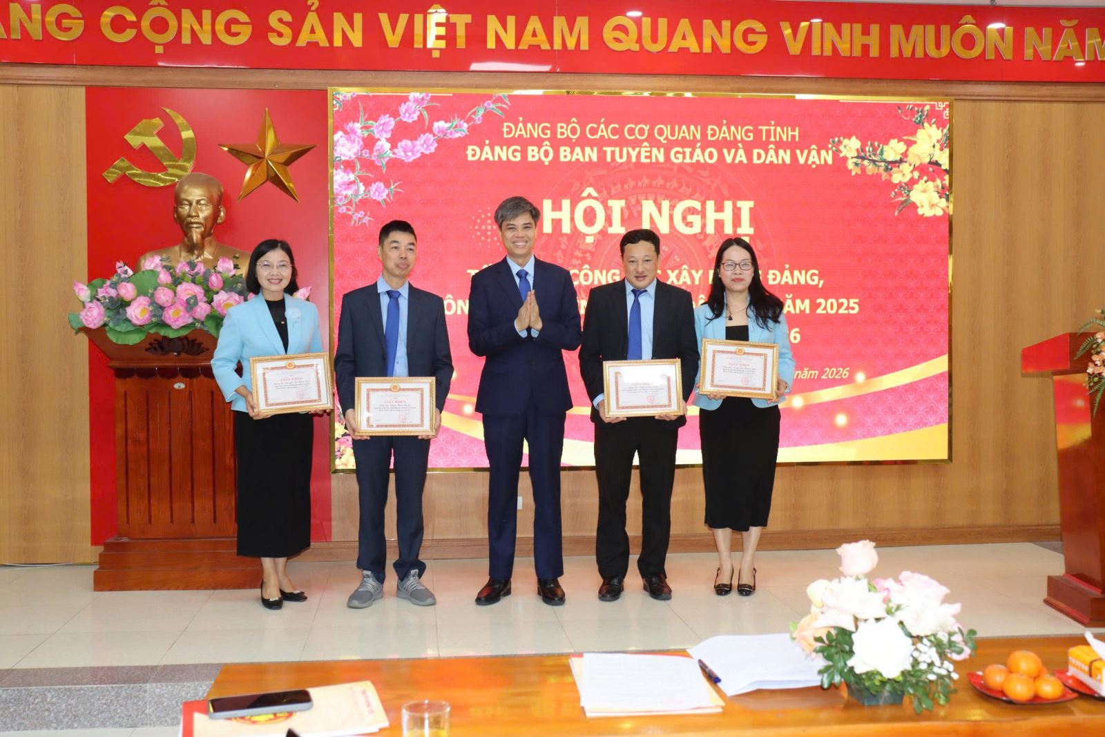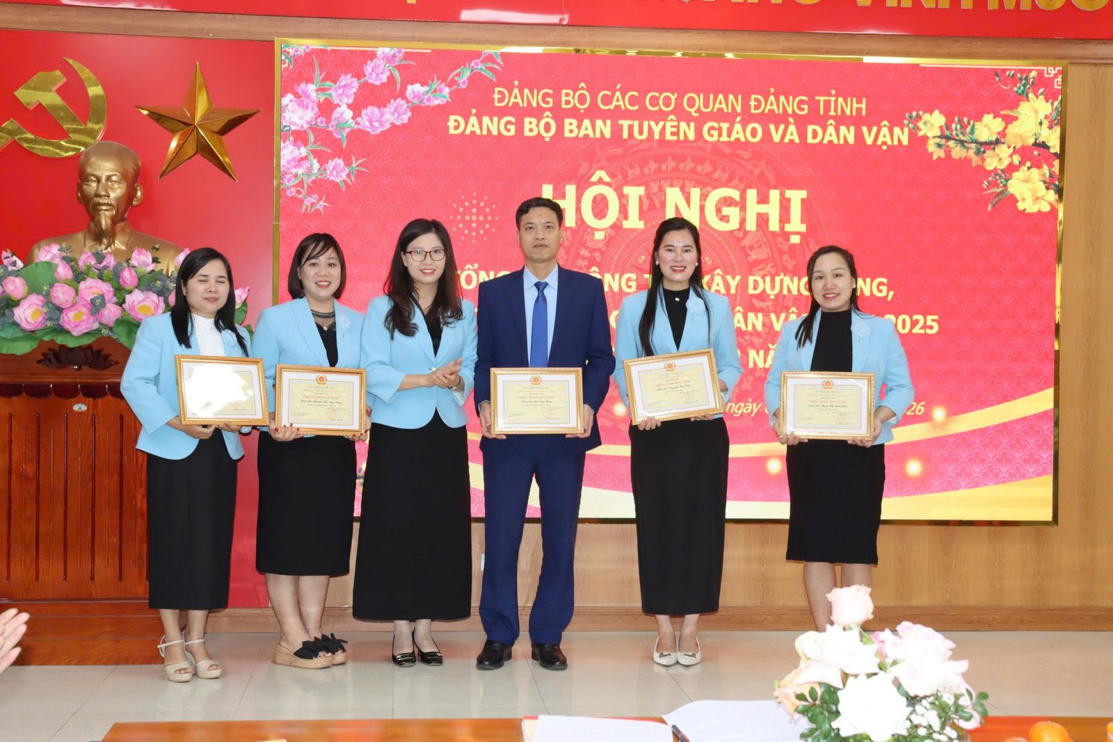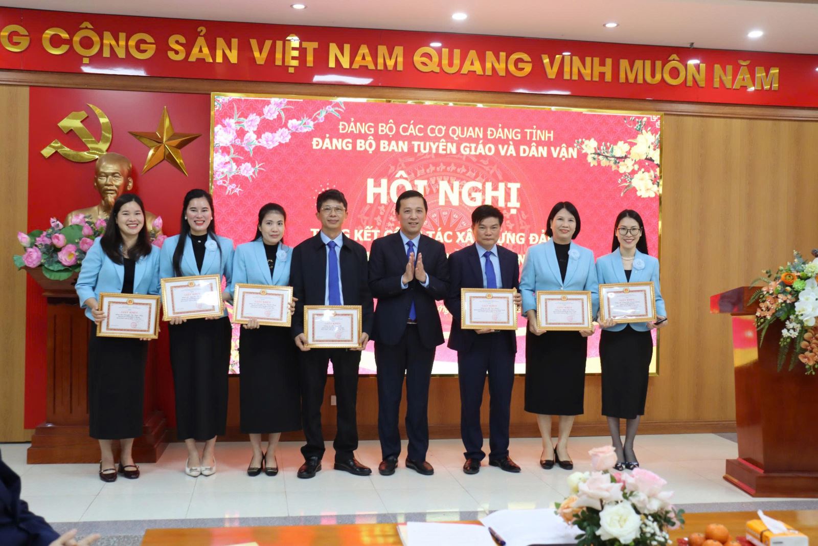 Nhân dịp này, Ban Tuyên giáo và Dân vận Tỉnh ủy đã tổ chức khen thưởng các tập thể, cá nhân có thành tích xuất sắc trong năm 2025. Đồng chí Nguyễn Văn Chiến trao Bằng khen của Ban Tuyên giáo và Dân vận Trung ương cho đồng chí Trịnh Thị Hoàng Yến, Phó Trưởng Ban. Có 03 cá nhân được nhận Bằng khen của Ban Thường vụ Tỉnh ủy; 01 tập thể (Phòng Tuyên truyền, báo chí, xuất bản) được tặng Cờ thi đua của Ủy ban nhân dân tỉnh; 02 tập thể (Phòng Thông tin tổng hợp và Phòng Dân vận các cơ quan Nhà nước) được tặng Bằng khen của Chủ tịch UBND tỉnh. Ngoài ra, 04 cá nhân được tặng Bằng khen của Chủ tịch UBND tỉnh; 13 đảng viên được Đảng ủy tặng Giấy khen hoàn thành xuất sắc nhiệm vụ và 20 cá nhân được tặng Danh hiệu Chiến sĩ thi đua cơ sở năm 2025.