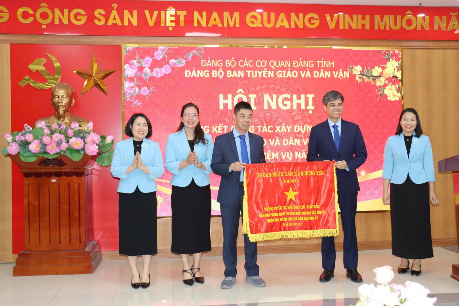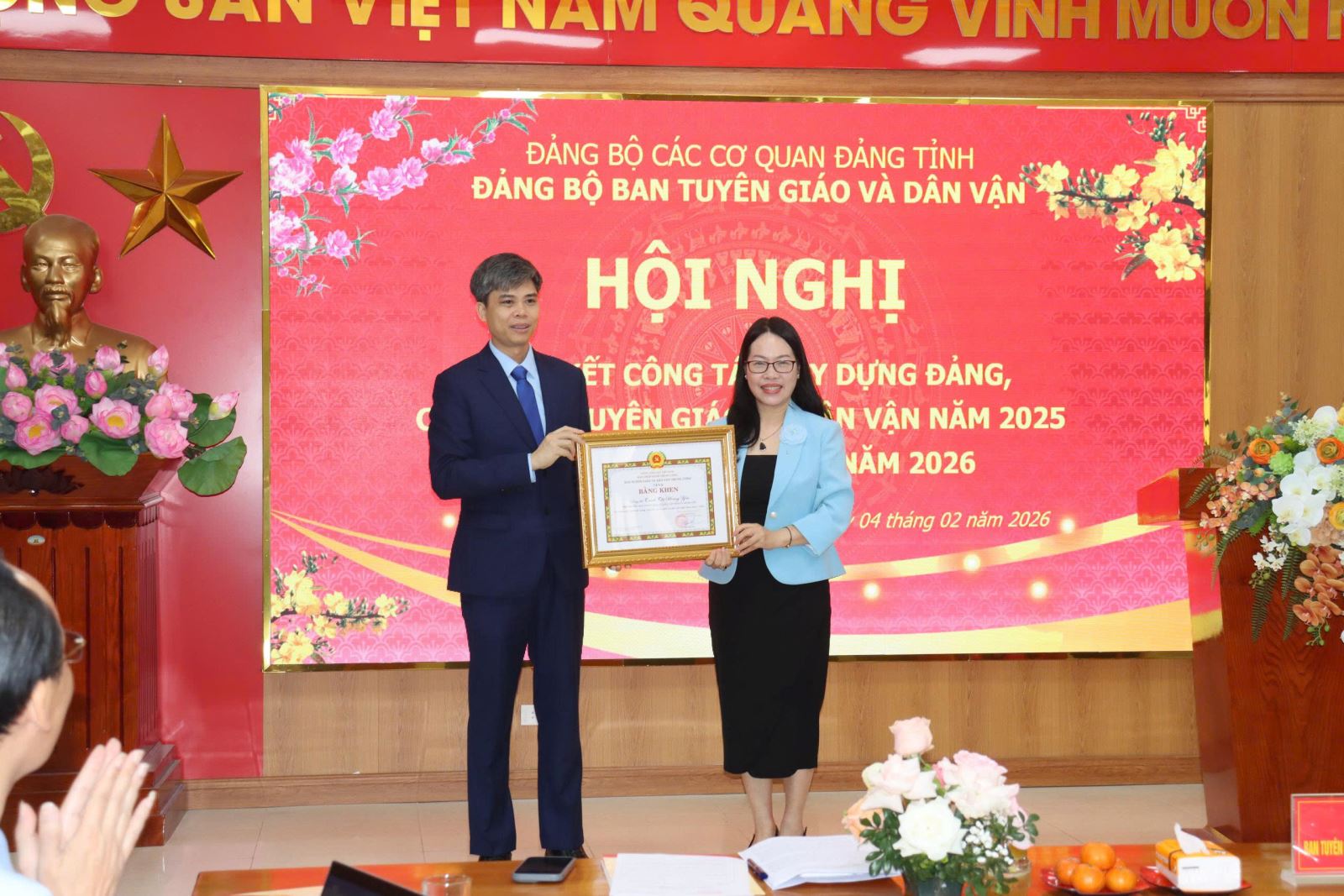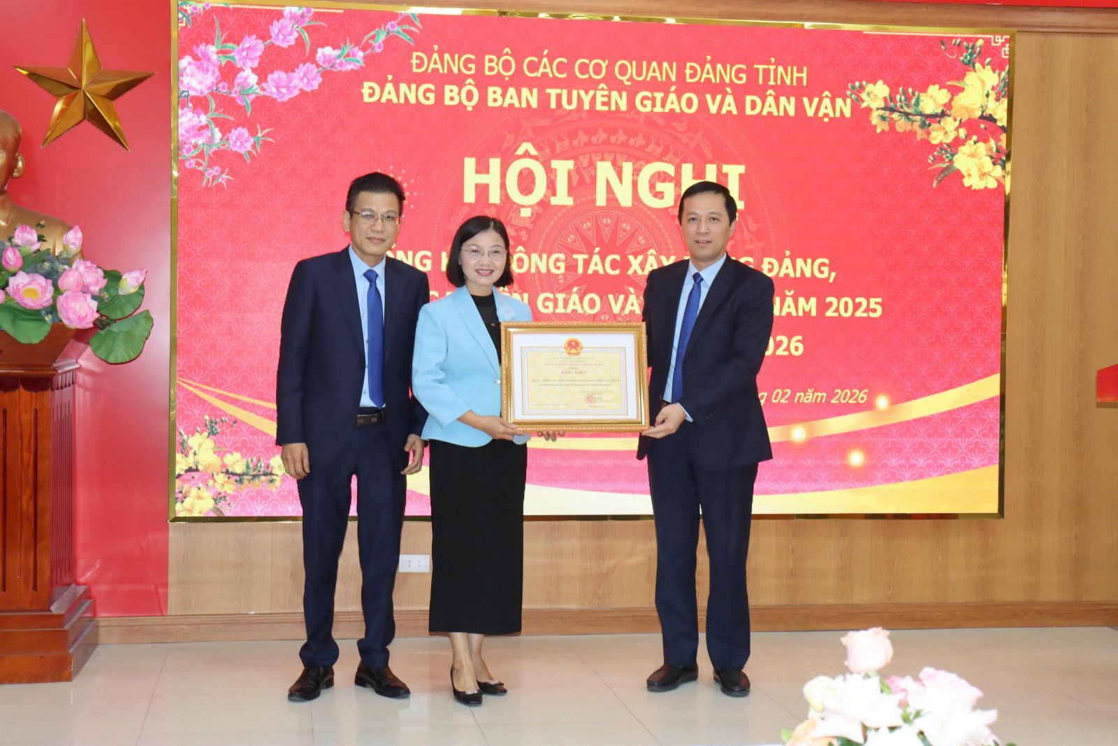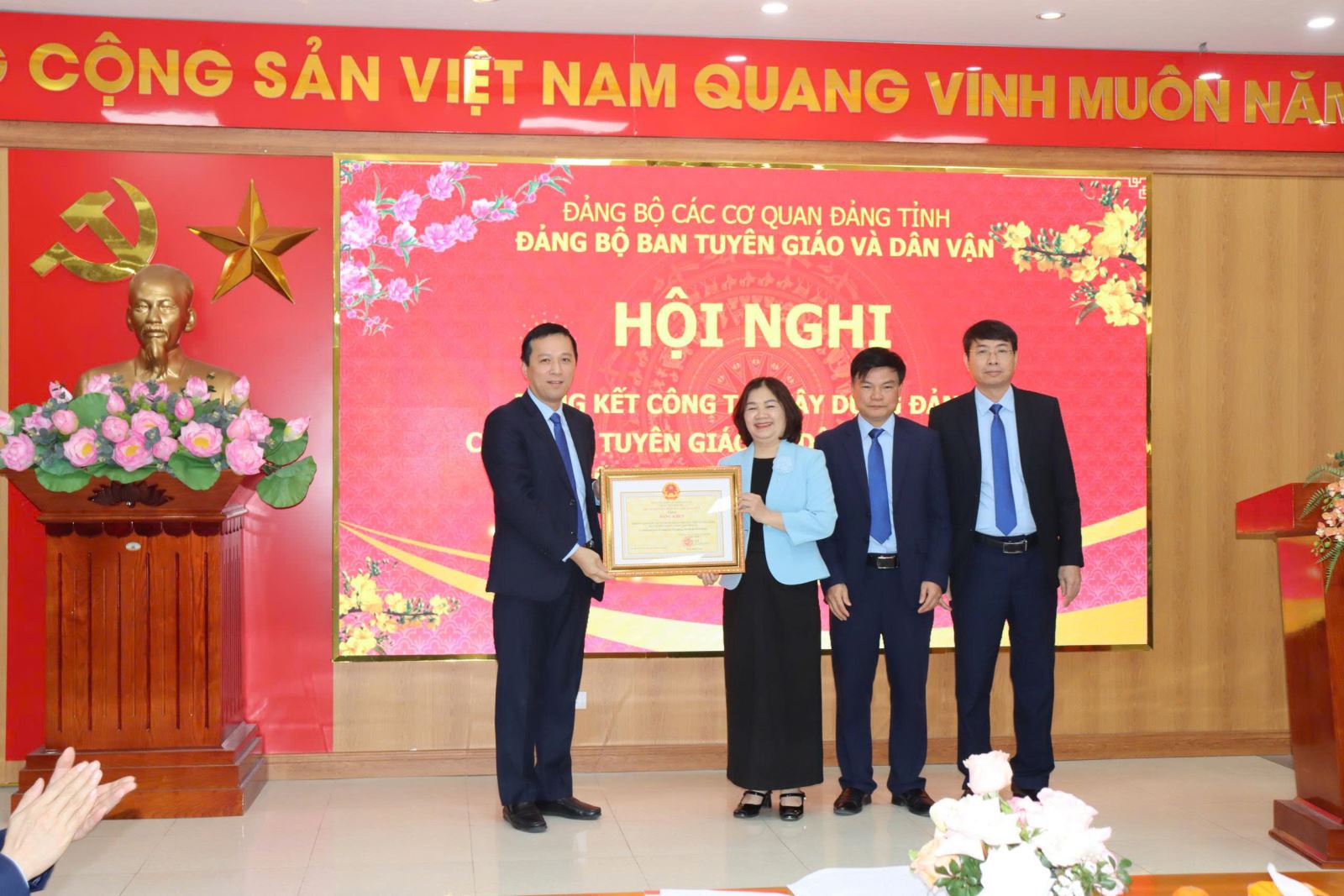 Nhân dịp này, Ban Tuyên giáo và Dân vận Tỉnh ủy đã tổ chức khen thưởng các tập thể, cá nhân có thành tích xuất sắc trong năm 2025. Đồng chí Nguyễn Văn Chiến trao Bằng khen của Ban Tuyên giáo và Dân vận Trung ương cho đồng chí Trịnh Thị Hoàng Yến, Phó Trưởng Ban. Có 03 cá nhân được nhận Bằng khen của Ban Thường vụ Tỉnh ủy; 01 tập thể (Phòng Tuyên truyền, báo chí, xuất bản) được tặng Cờ thi đua của Ủy ban nhân dân tỉnh; 02 tập thể (Phòng Thông tin tổng hợp và Phòng Dân vận các cơ quan Nhà nước) được tặng Bằng khen của Chủ tịch UBND tỉnh. Ngoài ra, 04 cá nhân được tặng Bằng khen của Chủ tịch UBND tỉnh; 13 đảng viên được Đảng ủy tặng Giấy khen hoàn thành xuất sắc nhiệm vụ và 20 cá nhân được tặng Danh hiệu Chiến sĩ thi đua cơ sở năm 2025.