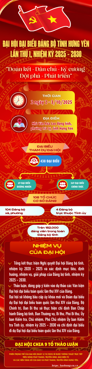 Đại hội đại biểu Đảng bộ tỉnh Hưng Yên lần thứ I, nhiệm kỳ 2025 - 2030 là sự kiện chính trị trọng đại, dấu mốc quan trọng, đánh dấu một chương mới cho sự phát triển của tỉnh Hưng Yên với một không gian mở rộng, tiềm năng, lợi thế lớn hơn. Đại hội cũng thể hiện ý chí, khát vọng của cán bộ, đảng viên và Nhân dân trong tỉnh phấn đấu xây dựng Hưng Yên giàu đẹp, phồn vinh, văn minh, hạnh phúc.