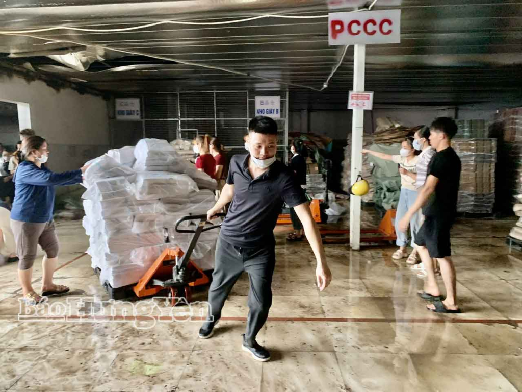 Công nhân Công ty TNHH Giày Ruixing Việt Nam di chuyển tài sản ra khỏi khu vực nguy hiểm.