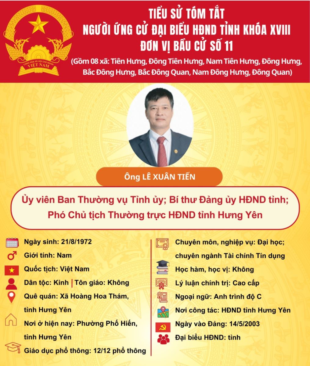 TIỂU SỬ VÀ CHƯƠNG TRÌNH HÀNH ĐỘNG CỦA ỨNG CỬ VIÊN ĐẠI BIỂU HĐND TỈNH KHÓA XVIII TẠI ĐƠN VỊ BẦU CỬ SỐ 11:ÔNG LÊ XUÂN TIẾN