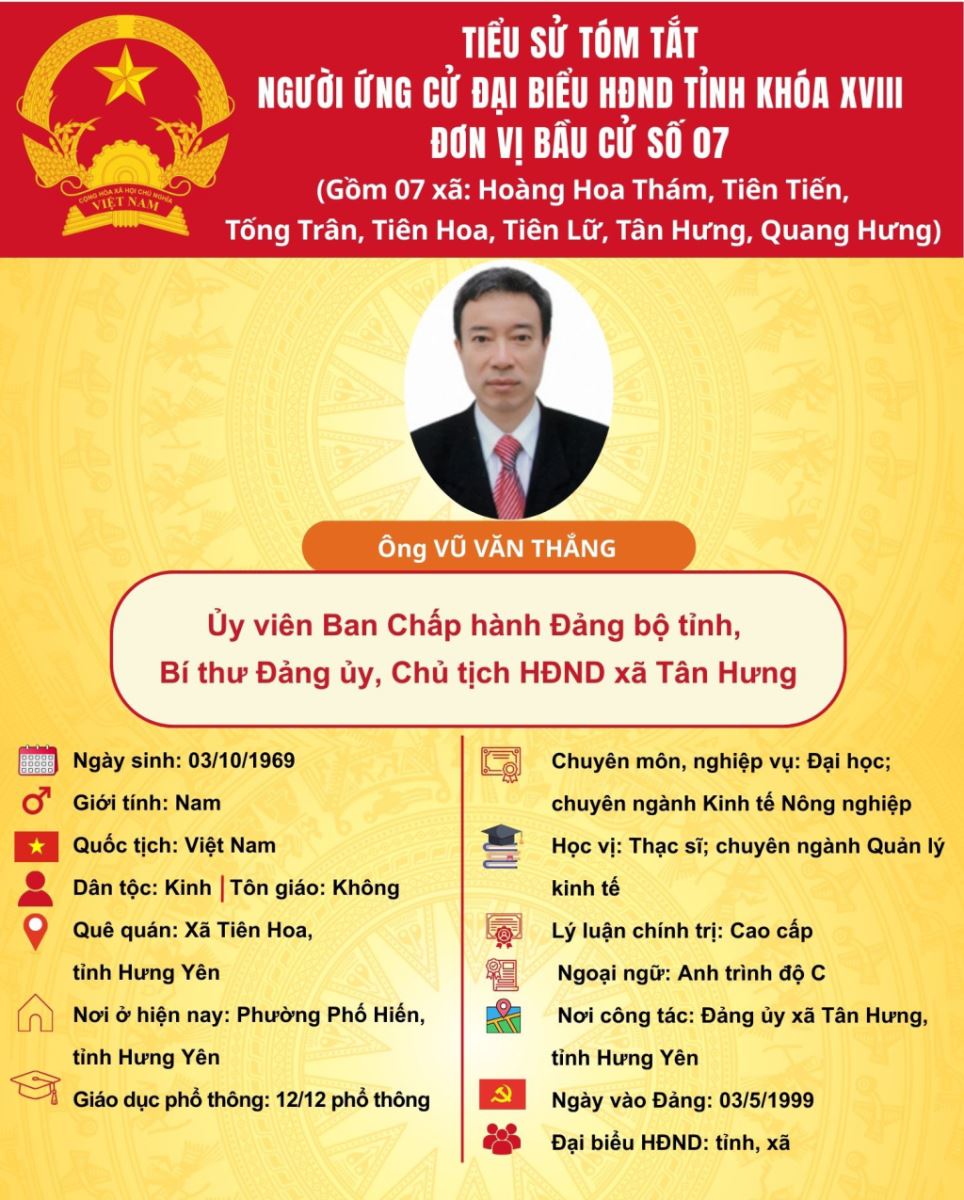 TIỂU SỬ VÀ CHƯƠNG TRÌNH HÀNH ĐỘNG CỦA ỨNG CỬ VIÊN ĐẠI BIỂU HĐND TỈNH KHÓA XVIII TẠI ĐƠN VỊ BẦU CỬ SỐ 7: ÔNG VŨ VĂN THẮNG