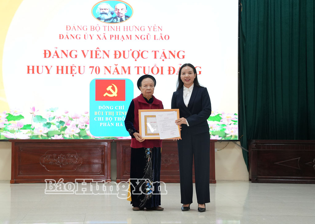 Tại buổi lễ, đồng chí Phó Chủ tịch Thường trực Ủy ban MTTQ Việt Nam tỉnh Ngô Thị Kim Hoàn trân trọng trao Huy hiệu 70 năm tuổi Đảng tặng đảng viên Bùi Thị Tính, sinh hoạt tại Chi bộ thôn Phần Hà, ghi nhận công lao đóng góp bền bỉ của đảng viên Bùi Thị Tính đối với sự nghiệp cách mạng của Đảng, sự nghiệp xây dựng và bảo vệ Tổ quốc. Đồng chí chúc mừng các đảng viên được nhận Huy hiệu Đảng lần này, chúc các đảng viên luôn mạnh khỏe, nêu cao tính tiên phong, gương mẫu trong công tác, hoàn thành xuất sắc nhiệm vụ, là tấm gương sáng trong giáo dục truyền thống cách mạng cho thế hệ trẻ, đóng góp trí tuệ vào thực hiện các nhiệm vụ chính trị của địa phương.