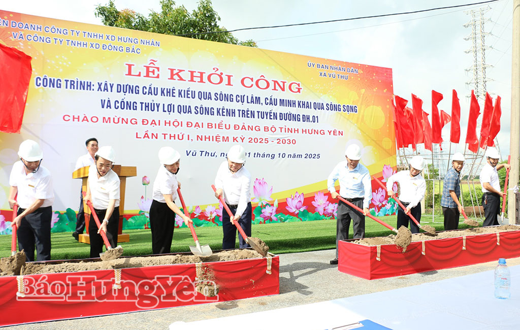 Sáng ngày 1/10, UBND xã Vũ Thư tổ chức lễ khởi công 3 công trình: cầu Khê Kiều qua sông Cự Lâm, cầu Minh Khai qua sông Sọng và cống thuỷ lợi qua sông Kênh trên tuyến đường ĐH.01 để chào mừng Đại hội đại biểu Đảng bộ tỉnh Hưng Yên lần thứ I, nhiệm kỳ 2025 - 2030. Tới dự lễ khởi công có đồng chí Đặng Thanh Giang, Ủy viên Ban Thường vụ Tỉnh ủy, Phó Chủ tịch HĐND tỉnh.