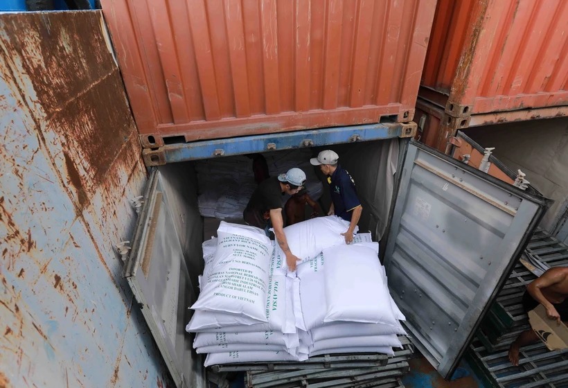 Bốc xếp, vận chuyển gạo xuất khẩu tại Công ty TNHH gạo Vinh Phát ở thành phố Long Xuyên, An Giang. (Ảnh: Vũ Sinh/TTXVN)