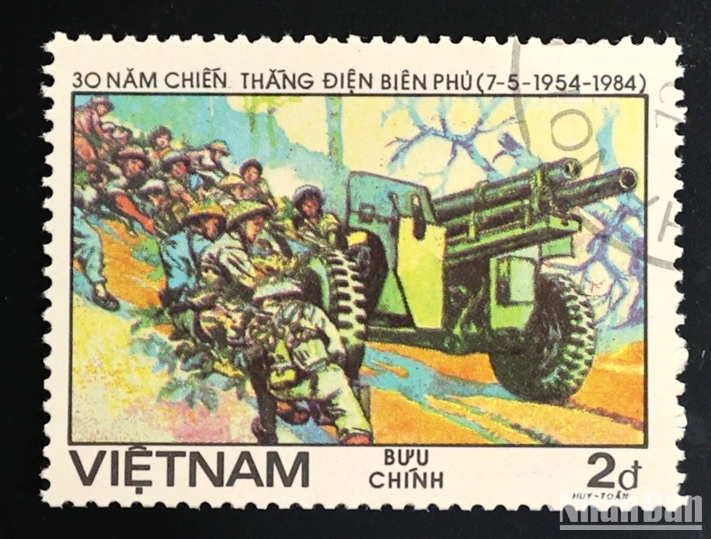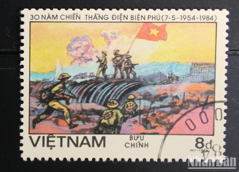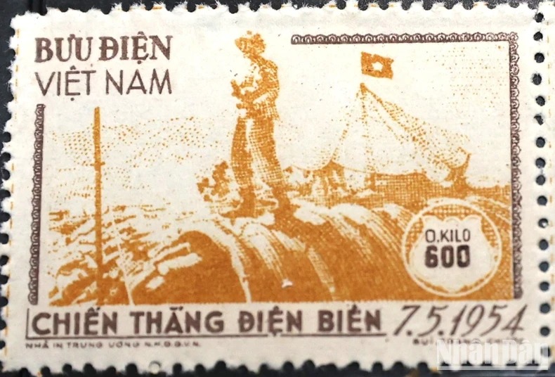 Trong ảnh là bộ tem Chiến thắng Điện Biên Phủ đầu tiên, phát hành tháng 10/1954, do họa sĩ Bùi Trang Chước thiết kế, sử dụng hình ảnh lịch sử những người lính đang cắm cờ chiến thắng trên nóc hầm tướng Đờ Cát.
