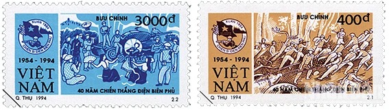 Bộ tem kỷ niệm 40 năm Chiến thắng Điện Biên Phủ, gồm hai mẫu, do họa sĩ Trịnh Quốc Thụ thiết kế, với hình ảnh kéo pháo vào trận địa và hình ảnh mừng chiến thắng. Bên góc trái mỗi mẫu tem có hình ảnh Huy hiệu Chiến sĩ Điện Biên, có giá 400 đồng và 3.000 đồng.