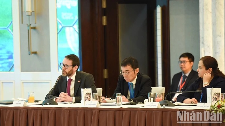Đại sứ Vương quốc Anh tại Việt Nam (ngoài cùng bên trái) phát biểu ý kiến tại Tọa đàm. (Ảnh: TRẦN HẢI)