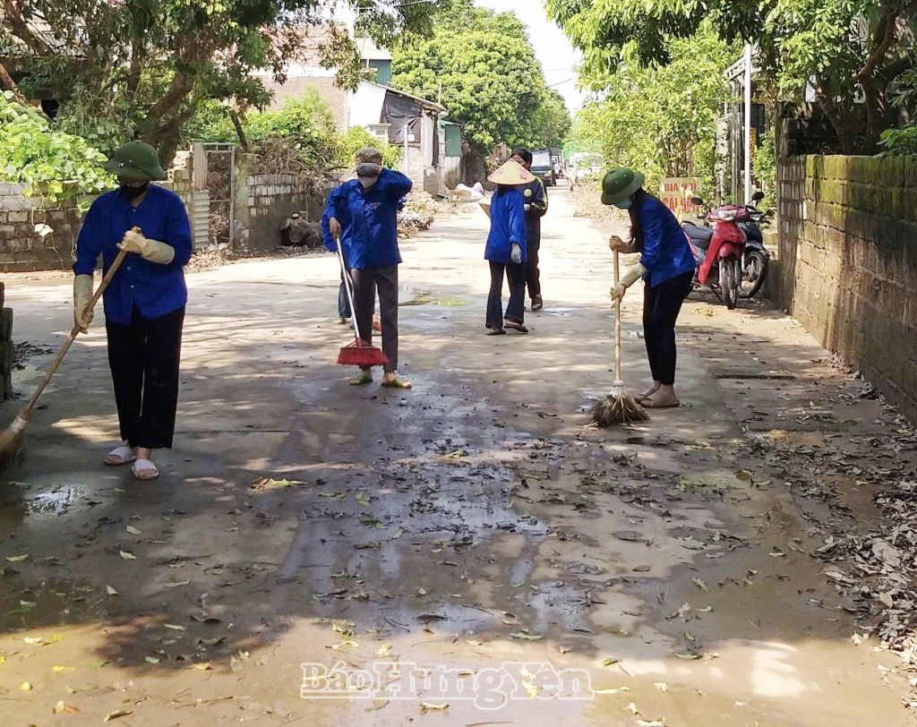 Đoàn viên thanh niên và hội viên phụ nữ xã Thụy Lôi (Tiên Lữ) dọn dẹp đường làng sau mưa lũ
