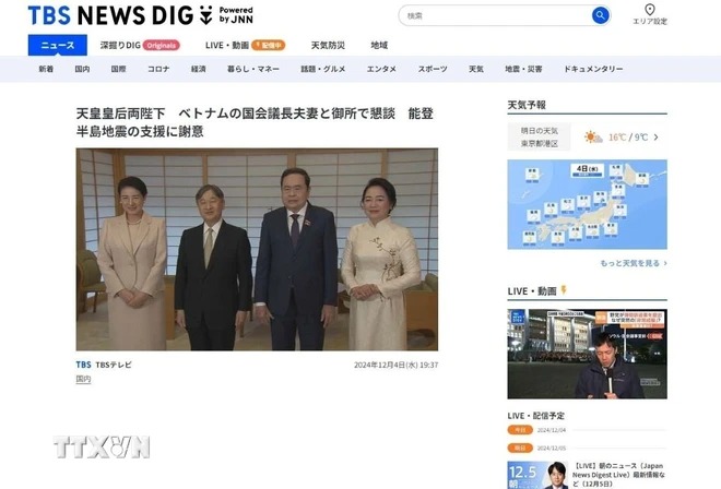 Truyền hình TBS đưa tin về việc "Chủ tịch Quốc hội Trần Thanh Mẫn và Phu nhân hội kiến Nhà vua Naruhito và Hoàng hậu Masako." *Ảnh: Nguyễn Tuyến/TTXVN)