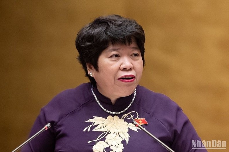 Chủ nhiệm Ủy ban Xã hội của Quốc hội Nguyễn Thúy Anh đại diện Đoàn giám sát báo cáo tại phiên họp. (Ảnh: ĐĂNG KHOA)