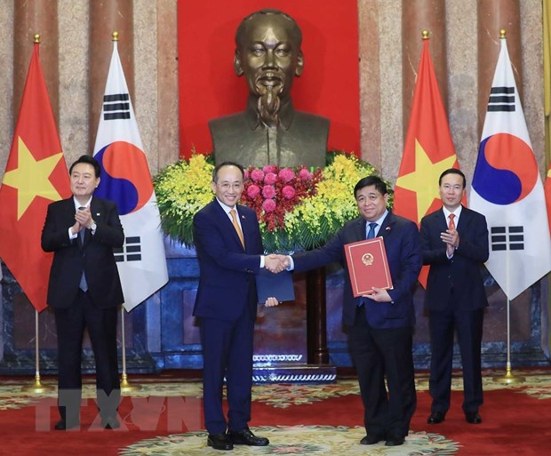 Chủ tịch nước Võ Văn Thưởng và Tổng thống Hàn Quốc Yoon Suk Yeol chứng kiến Lễ trao Bản ghi nhớ giữa Bộ Kế hoạch và Đầu tư với Bộ Kinh tế, Tài chính Hàn Quốc về hợp tác kinh tế thông qua Quỹ EDCF và Quỹ EDPF. (Ảnh: Thống Nhất/TTXVN)
