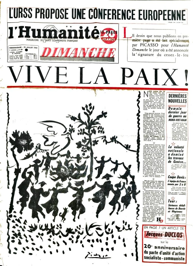 Với bức họa của Picasso đăng trên trang nhất số đặc biệt ra ngày 25/7/1954, báo Nhân đạo của Đảng Cộng sản Pháp cũng có bài xã luận gửi gắm lời chúc mừng thật nức lòng như vậy: Tất cả chúng ta đều chung một niềm hạnh phúc. Hoà bình muôn năm! Hạnh phúc muôn năm!