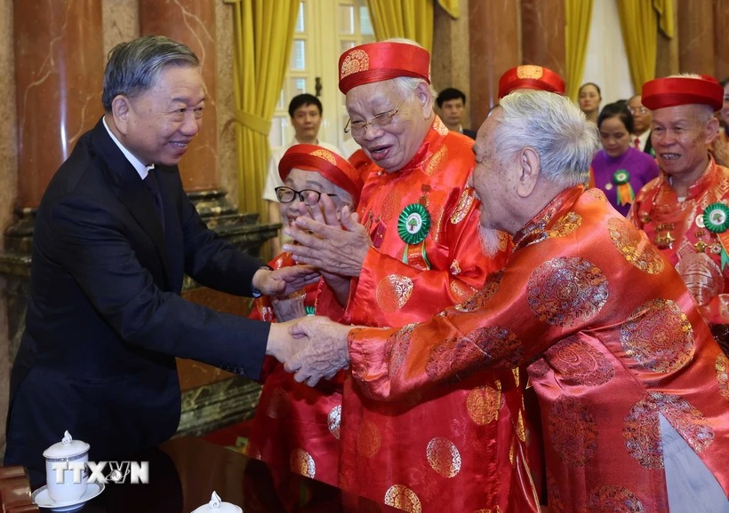 Chủ tịch nước Tô Lâm với người cao tuổi tiêu biểu. (Ảnh: Nhan Sáng/TTXVN)