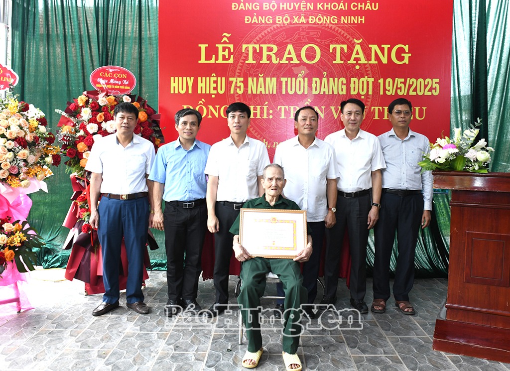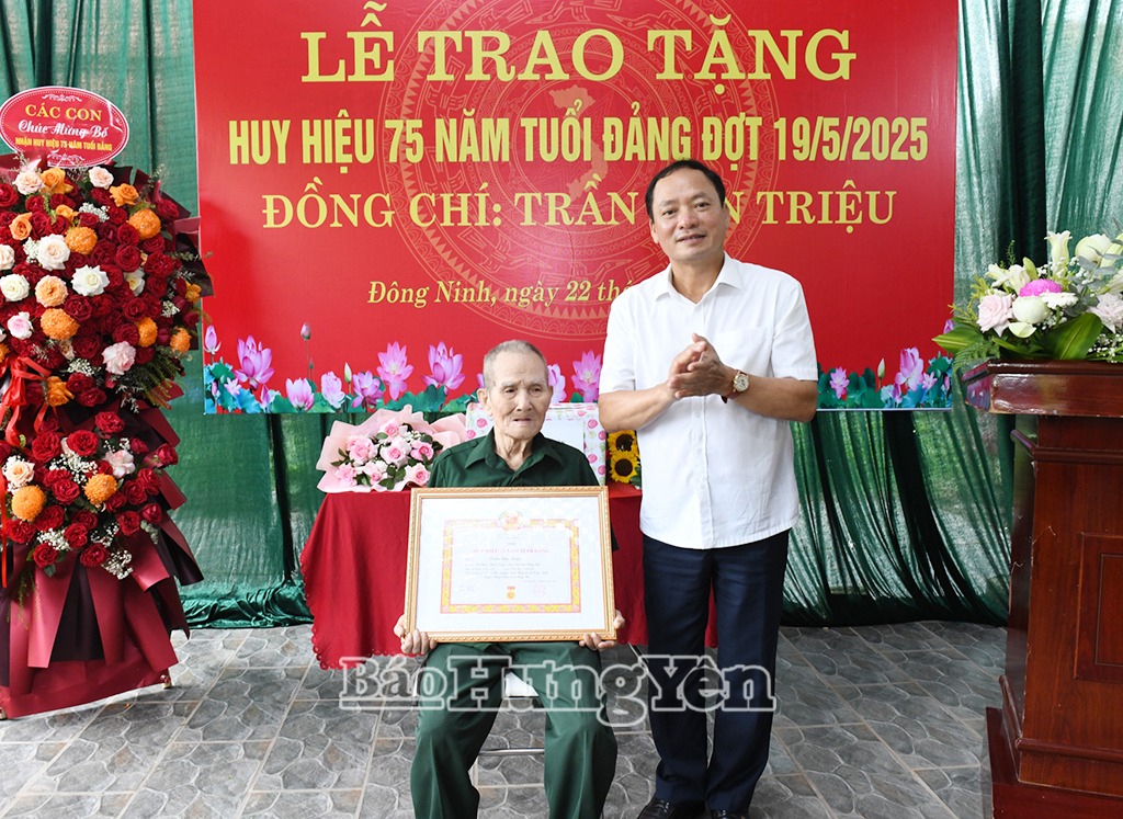 Sáng ngày 22/5, đồng chí Trần Quốc Văn, Phó Bí thư Tỉnh ủy, Chủ tịch UBND tỉnh đến trao Huy hiệu 75 năm tuổi Đảng đợt 19/5/2025 tặng đảng viên Khương Văn Đương, sinh hoạt tại Chi bộ thôn Tuấn Dị, Đảng bộ xã Trưng Trắc (Văn Lâm) và đảng viên Trần Văn Triệu, sinh hoạt tại Chi bộ thôn Duyên Linh, Đảng bộ xã Đông Ninh (Khoái Châu). Cùng đi có đồng chí Phạm Văn Khuê, Ủy viên Ban Thường vụ Tỉnh ủy, Trưởng ban Tổ chức Tỉnh ủy; lãnh đạo các huyện: Văn Lâm, Khoái Châu.