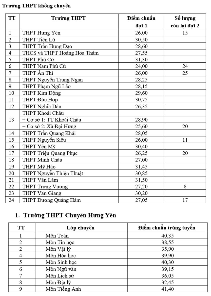 Điểm trúng tuyển vào lớp 10 các trường THPT và THPT Chuyên Hưng Yên như sau: