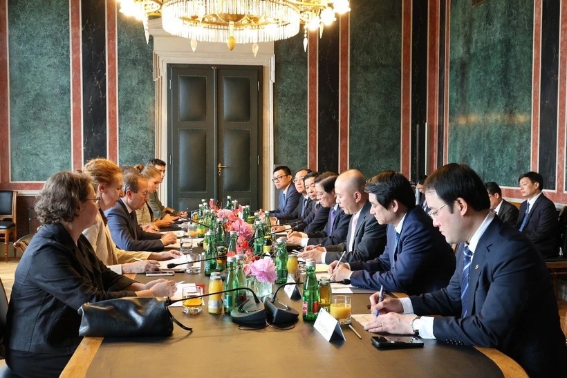Đoàn đại biểu Đảng cộng sản Việt Nam làm việc cùng Phó Chủ tịch Hội đồng Quốc gia Áo, Peter Haubner. (Ảnh: Thu Hằng/TTXVN)