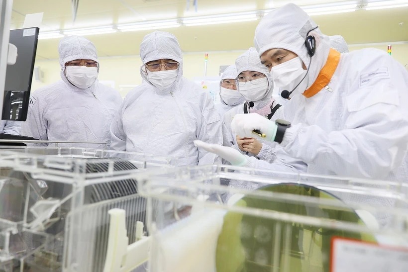 Thủ tướng Phạm Minh Chính thăm dây chuyền sản xuất chíp bán dẫn của Công ty TNHH Hana Micro Vina. (Ảnh: Dương Giang/TTXVN)