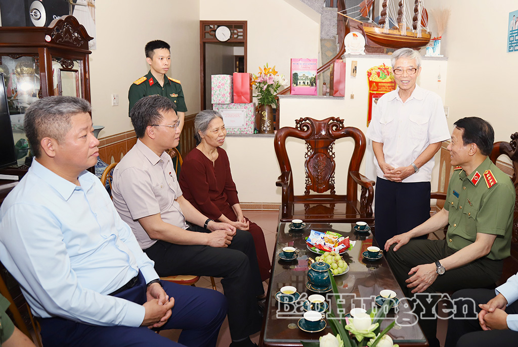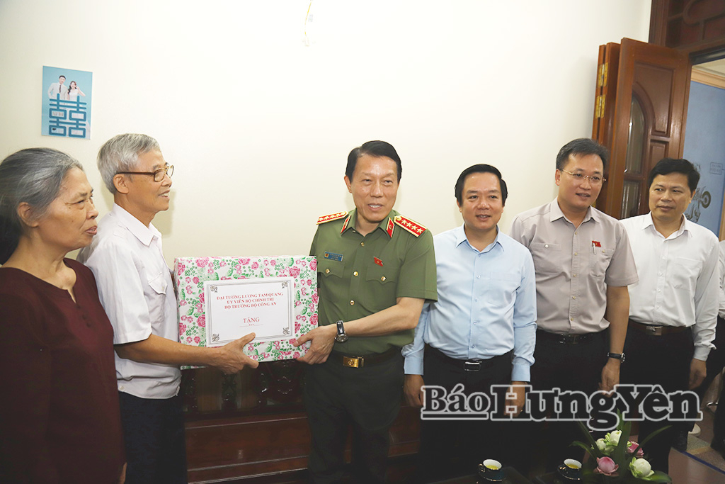 Đại tướng Lương Tam Quang, Ủy viên Bộ Chính trị, Bộ trưởng Bộ Công an đến thăm, tặng quà gia đình thương binh Đoàn Văn Vàng (phường Phố Hiến).