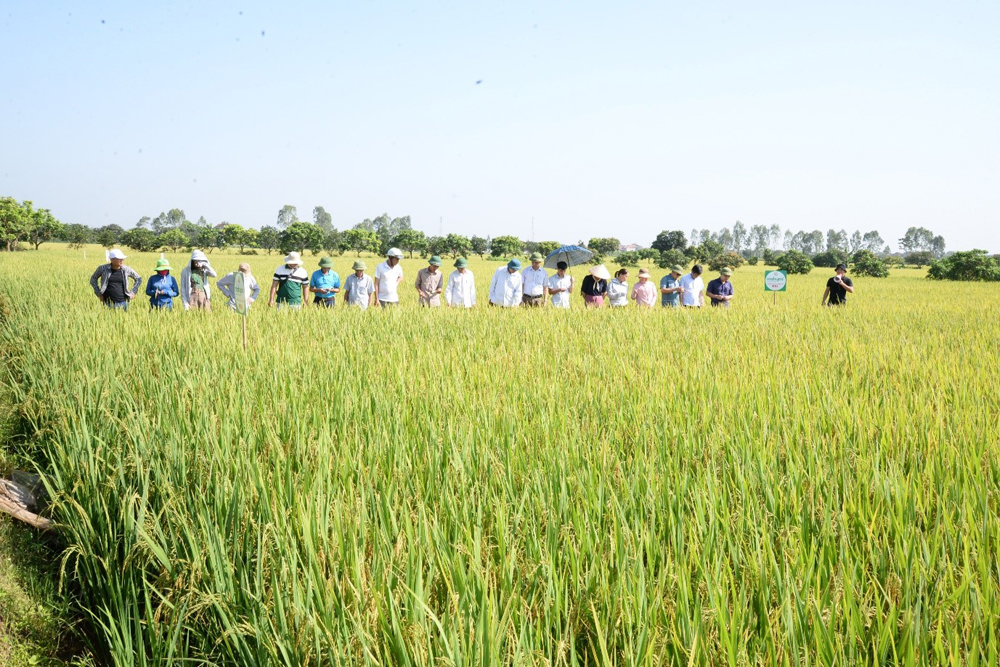 Các đại biểu tham quan mô hình canh tác giống lúa N91 tại thôn Trắc Điền, xã Đa Lộc (Ân Thi)