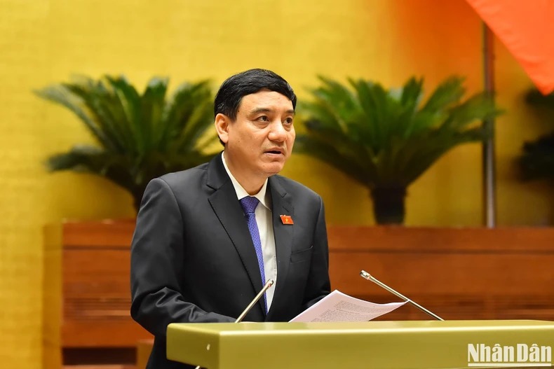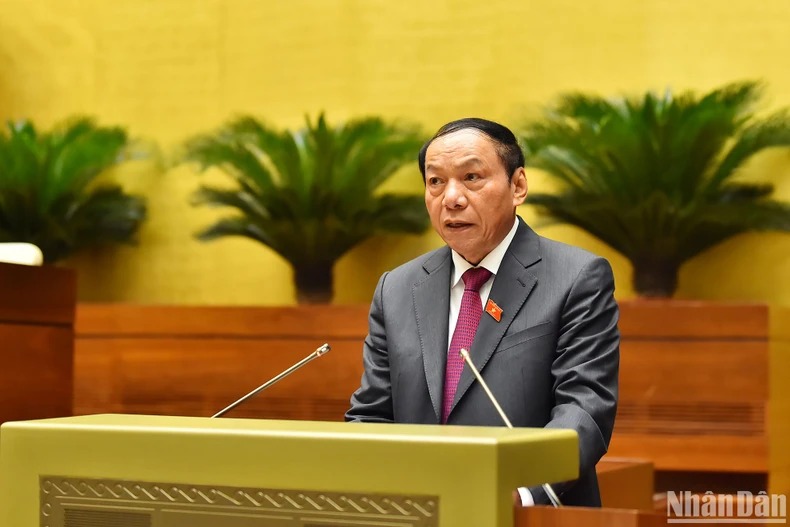 Bộ trưởng Văn hóa, Thể thao và Du lịch Nguyễn Văn Hùng trình bày tờ trình về chủ trương đầu tư Chương trình mục tiêu quốc gia về phát triển văn hóa giai đoạn 2025-2035. (Ảnh: THỦY NGUYÊN)