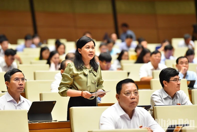 Góp ý vào dự thảo Luật Đường bộ, đại biểu Quốc hội Nguyễn Phương Thủy (Đoàn TP Hà Nội) đề nghị cân nhắc bổ sung thu phí vào nội đô áp dụng với ô-tô cá nhân đi vào một số khu vực đô thị, trong những khung thời gian nhất định. (Ảnh: SƠN BÁCH)