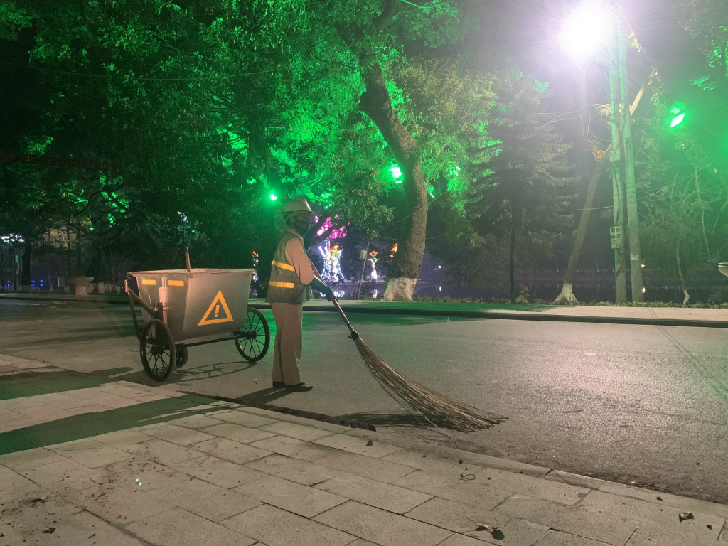 Công nhân vệ sinh Công ty cổ phần Môi trường và Công trình đô thị Hưng Yên (thành phố Hưng Yên) trực 100% dọn dẹp đường phố đêm giao thừa