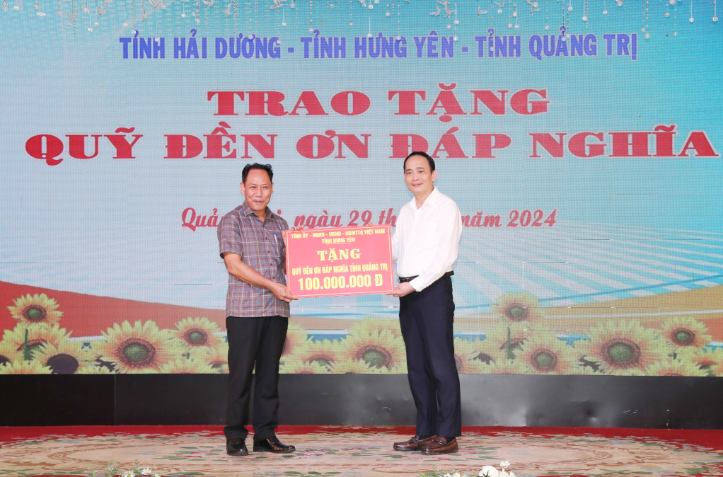 Dịp này, đoàn cán bộ hai tỉnh Hưng Yên và Hải Dương trao tặng Quỹ "Đền ơn đáp nghĩa" tỉnh Quảng Trị 200 triệu đồng (mỗi tỉnh 100 triệu đồng).