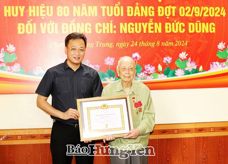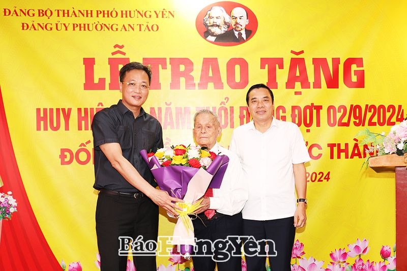 Đồng chí Bí thư Tỉnh ủy Nguyễn Hữu Nghĩa trân trọng trao Huy hiệu 80 năm tuổi Đảng tặng đảng viên Nguyễn Đức Dũng, sinh năm 1926, sinh hoạt tại Chi bộ tổ dân phố Hai Bà Trưng, Đảng bộ phường Quang Trung (thành phố Hưng Yên); trao Huy hiệu 75 năm tuổi Đảng tặng đảng viên Lê Đức Thành, sinh năm 1930, sinh hoạt tại Chi bộ tổ dân phố An Bình, Đảng bộ phường An Tảo (thành phố Hưng Yên); trao Huy hiệu 75 năm tuổi Đảng tặng đảng viên Nguyễn Sinh Thượng, sinh năm 1930, sinh hoạt tại Chi bộ 2 Tứ Mỹ, Đảng bộ phường Phùng Chí Kiên (thị xã Mỹ Hào).