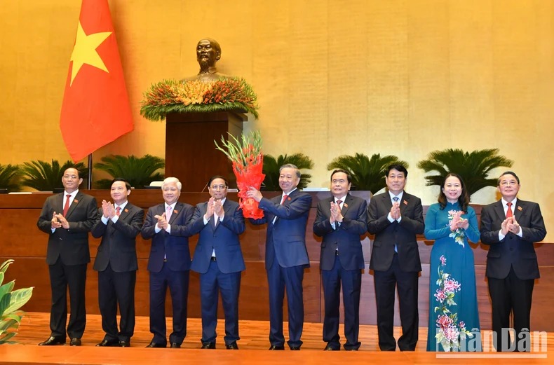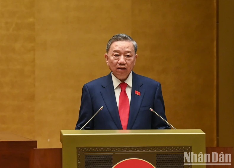 Trước Quốc hội và đồng bào, cử tri cả nước, Chủ tịch nước Tô Lâm tuyên thệ: “Dưới cờ đỏ sao vàng thiêng liêng của Tổ quốc, trước Quốc hội và đồng bào cử tri cả nước, tôi Chủ tịch nước Cộng hòa xã hội chủ nghĩa Việt Nam xin tuyên thệ: Tuyệt đối trung thành với Tổ quốc, nhân dân và Hiến pháp nước Cộng hòa xã hội chủ nghĩa Việt Nam, nỗ lực phấn đấu hoàn thành tốt nhiệm vụ được Đảng, Nhà nước và nhân dân giao phó”.