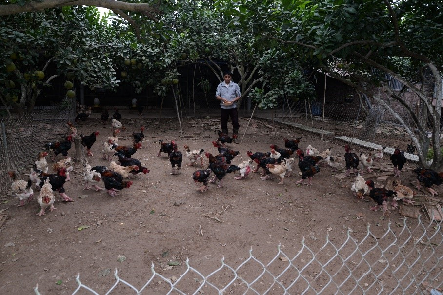 Nông dân xã Đông Tảo (Khoái Châu) chăm sóc gà thịt