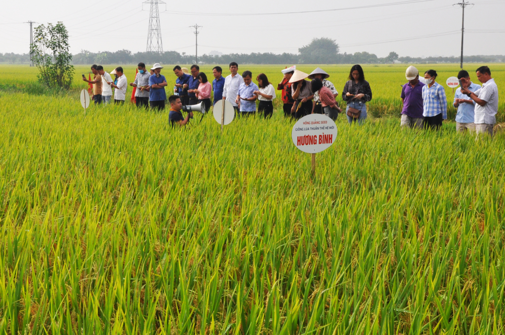 Các đại biểu và nông dân tham quan mô hình giống lúa thuần Hương Bình