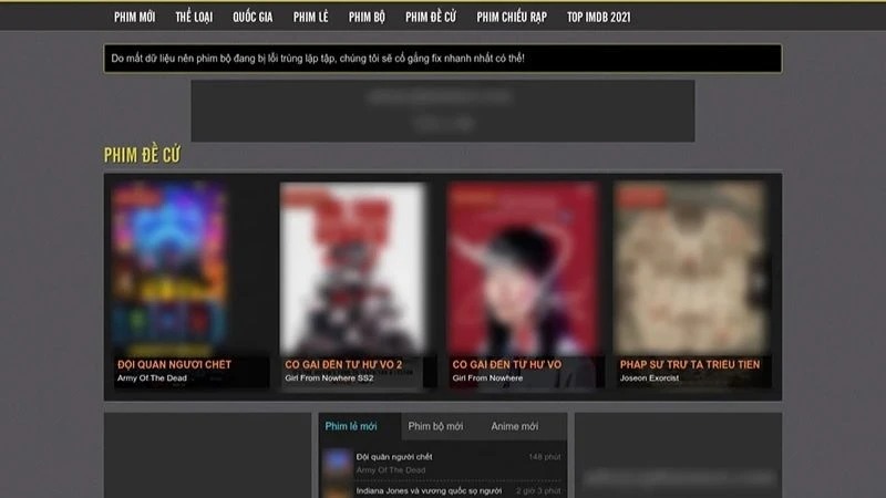 Giao diện trang web phát tán phim lậu nổi tiếng "lỳ đòn nhất Việt Nam" đã bị khởi tố hình sự tháng 8/2021. Ảnh chụp màn hình