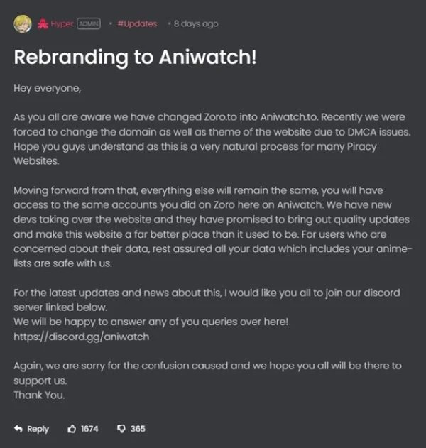 Thông báo "đổi thương hiệu" thành Aniwatch của dịch vụ phát trực tuyến trái phép Zoro.to sau khi bị đóng. Nguồn: TorrentFreak