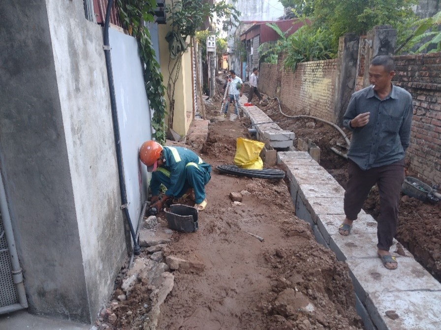 Nhân viên kỹ thuật Công ty cổ phần cấp nước Phú Hưng ( thành phố Hưng Yên) phối hợp bảo vệ hạ tầng nước sạch khi thi công làm đường trên địa bàn phường An Tảo