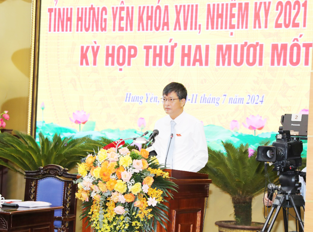 Thay mặt UBND tỉnh, đồng chí Nguyễn Lê Huy, Ủy viên Ban Thường vụ Tỉnh ủy, Phó Chủ tịch Thường trực UBND tỉnh báo cáo tình hình thực hiện kế hoạch phát triển kinh tế - xã hội; thu chi ngân sách nhà nước; kế hoạch vốn đầu tư công 6 tháng đầu năm và nhiệm vụ, giải pháp chủ yếu 6 tháng cuối năm 2024. Theo báo cáo, trong 6 tháng đầu năm, tình hình kinh tế - xã hội của tỉnh đạt được kết quả tích cực. Tăng trưởng kinh tế duy trì ở mức khá, ngành xây dựng tiếp tục phát triển, ngành công nghiệp nỗ lực vượt qua khó khăn, nông nghiệp phát triển ổn định. Tổng thu ngân sách vượt tiến độ đề ra. Tổng sản phẩm trên địa bàn tỉnh (GRDP) tăng 6,81%, xếp thứ 8/11 tỉnh, thành phố thuộc khu vực đồng bằng sông Hồng. Tổng vốn đầu tư phát triển toàn xã hội là 31.877,8 tỷ đồng, đạt 45,5% kế hoạch. Tổng thu ngân sách đến hết ngày 30/6/2024 là 22.066 tỷ đồng, đạt 67,2% dự toán HĐND tỉnh giao, trong đó thu nội địa 19.898 tỷ đồng. Tỷ lệ trường học các cấp đạt chuẩn quốc gia là 81,56%; tỷ lệ phòng học kiên cố đạt 95,85%; tạo việc làm mới cho 12.590 người; tỷ lệ người dân tham gia bảo hiểm y tế đạt 93,5%; tỷ lệ lao động trong độ tuổi tham gia bảo hiểm xã hội đạt 44. Dự kiến đợt 1 năm 2024 đề nghị công nhận thêm 2 huyện Văn Giang và Phù Cừ đạt chuẩn nông thôn mới nâng cao, 26 xã đạt chuẩn nông thôn mới nâng cao, 8 xã đạt chuẩn nông thôn mới kiểu mẫu. Về môi trường, đô thị, tỷ lệ chất thải nguy hại được thu gom, xử lý ước đạt 100%; tỷ lệ chất thải rắn sinh hoạt đô thị được thu gom, xử lý ước đạt 90%; tỷ lệ khu công nghiệp đang hoạt động có hệ thống xử lý nước thải tập trung đạt tiêu chuẩn môi trường ước đạt 100%; tỷ lệ đô thị hóa ước đạt 45%...