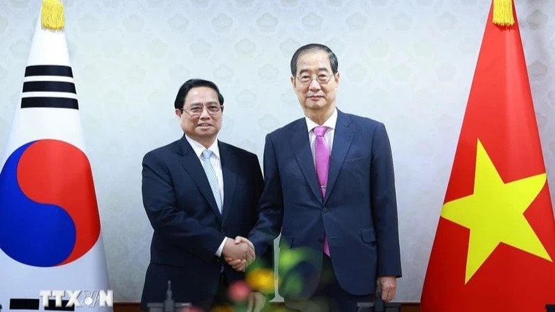Thủ tướng Phạm Minh Chính hội đàm với Thủ tướng Hàn Quốc Han Duck Soo. (Ảnh: TTXVN)