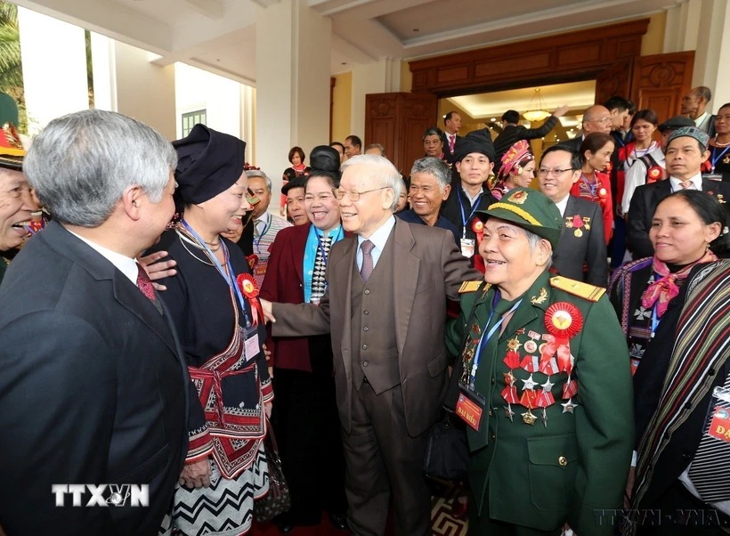 Tổng Bí thư Nguyễn Phú Trọng gặp mặt đại biểu người có uy tín, nhân sỹ, trí thức, doanh nhân dân tộc thiểu số tiêu biểu toàn quốc năm 2017. (Ảnh: Trí Dũng/TTXVN)