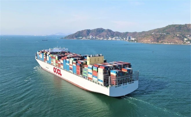Siêu tàu container M/V OOCL SPAIN hành trình từ phao số 0 vào cảng Gemalink (cụm cảng Cái Mép-Thị Vải, thị xã Phú Mỹ, tỉnh Bà Rịa-Vũng Tàu). (Ảnh: TTXVN phát)