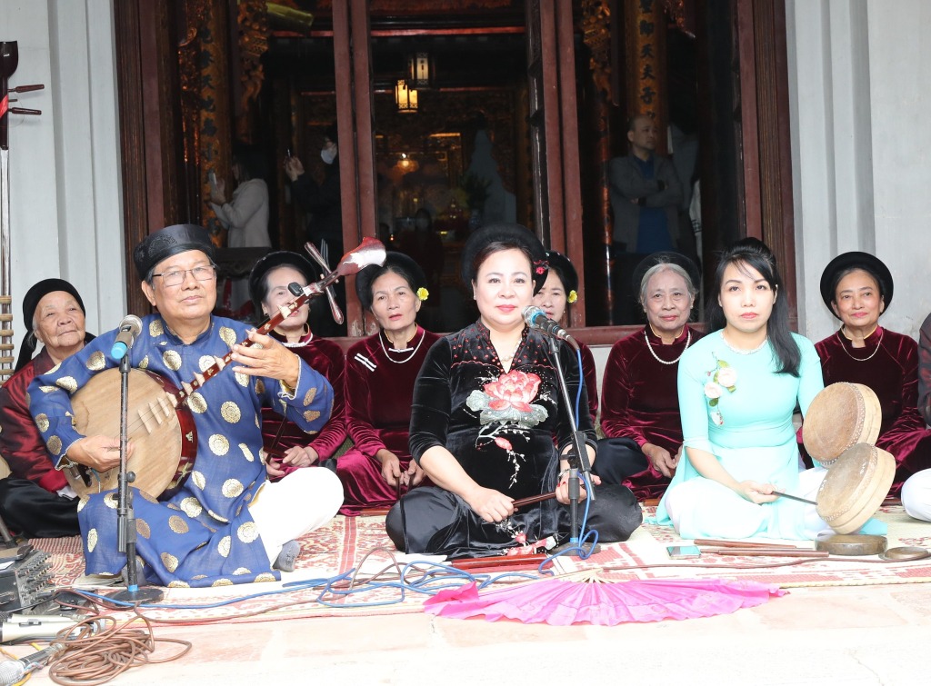 Nghệ nhân nhân dân Đỗ Thị Thanh Nhàn (ngồi giữa hàng đầu) biểu diễn nghệ thuật hát ca trù