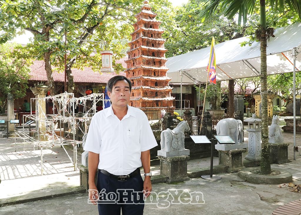 Đền An Xá (còn gọi tên khác là Đậu An), tọa lạc tại thôn An Xá, xã An Viên (Tiên Lữ). Ngày 31/12/2020, đền An Xá được Thủ tướng Chính phủ xếp hạng di tích quốc gia đặc biệt. Trong đền có 2 bảo vật quốc gia là Tháp đất nung và Bệ thờ đất nung. Mỗi năm, đền An Xá đón hàng vạn du khách thập phương đến tham quan, chiêm bái. Ông Nguyễn Ngọc Bình, thành viên trong Ban quản lý di tích đền An Xá đã gắn bó với việc trông coi, bảo vệ, phát huy giá trị ngôi đền trong gần 20 năm nay. Ngày nào dù nắng hay mưa, ông cũng có mặt ở đền để trông coi, vệ sinh sạch sẽ di tích, đóng, mở cửa đón khách tham quan, tận tình hướng dẫn cho du khách thập phương các nghi thức truyền thống, thực hiện nếp sống văn minh tại di tích. Những ngày khách tham quan đông, đến giờ ăn, ông Bình và các thành viên trong Ban quản lý di tích thay phiên nhau, bảo đảm thường xuyên có người trực. Ông Bình còn là người góp công không nhỏ trong việc vận động khách thập phương công đức, kiến thiết ngôi đền trở nên khang trang như hiện nay. Suốt gần 20 năm tận tụy, cần mẫn, trách nhiệm với công việc trông coi, bảo vệ đền An Xá như vậy, nhưng ông không nhận thù lao. Ông Bình chia sẻ: Tôi xác định đây là việc làm tự nguyện, góp một phần công sức nhỏ bé của người con quê hương trong công tác bảo tồn và phát huy giá trị của di sản văn hóa do cha ông để lại. Điều mong mỏi lớn nhất của tôi là di tích đền An Xá tiếp tục được các cấp, các ngành quan tâm đầu tư tôn tạo, tu bổ để ngày càng khang trang hơn. Có như vậy mới thực sự xứng đáng với giá trị văn hoá – lịch sử của di tích này.