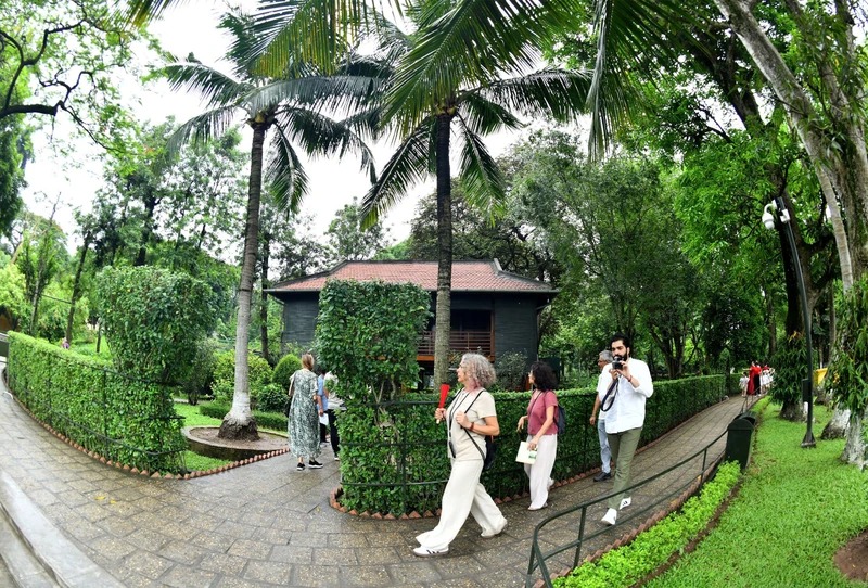 Du khách tham quan Nhà sàn Bác Hồ trong Khu Di tích Phủ Chủ tịch. (Ảnh ĐĂNG KHOA)