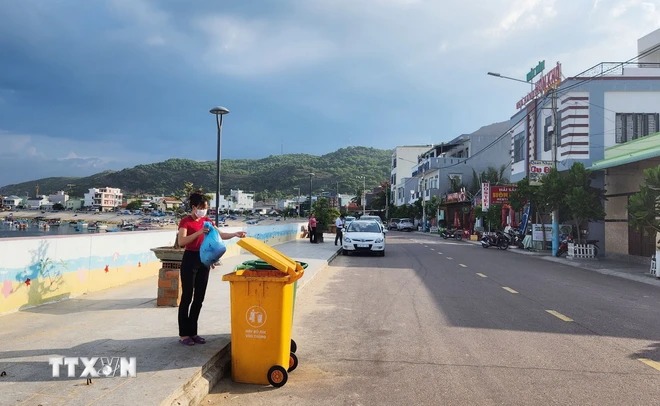 Người dân xã Đảo Nhơn Hải, thành phố Quy Nhơn, tỉnh Bình Định phân loại rác. (Ảnh: Sỹ Thắng/TTXVN)
