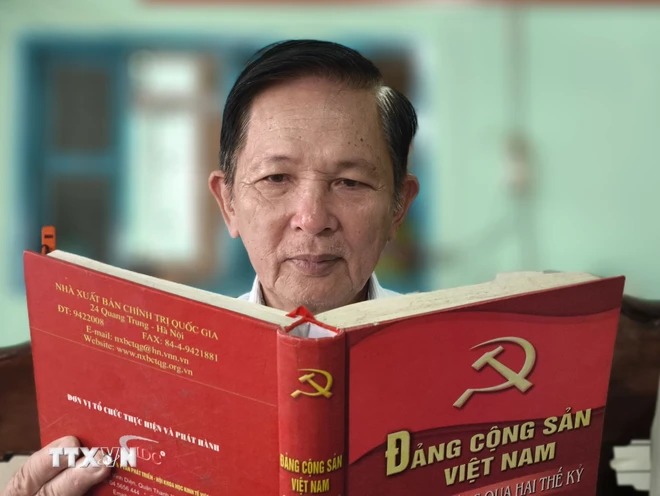 Ông Lê Văn Thiệm, Đảng viên 35 năm tuổi đảng, tại ấp 6 Thị trấn Giồng Trôm (Bến Tre) nghiên cứu văn kiện của Đảng. (Ảnh: Huỳnh Phúc Hậu/ TTXVN)