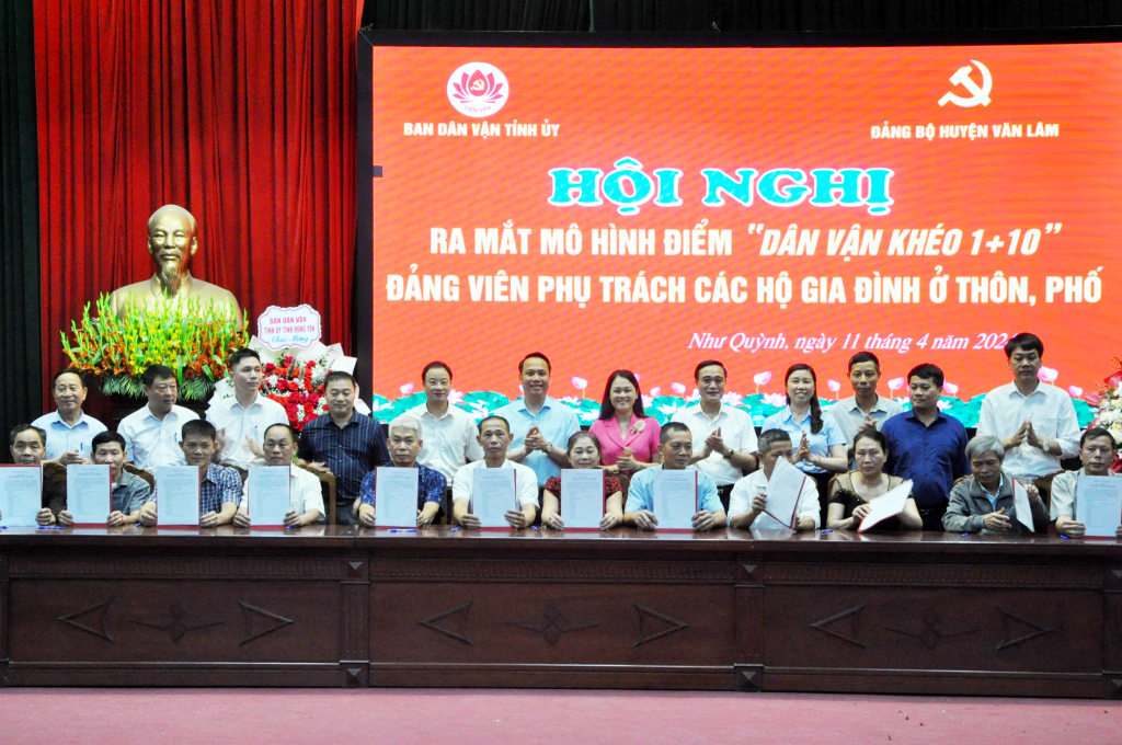 Ngày 11/4, Ban Dân vận Tỉnh ủy tổ chức hội nghị ra mắt mô hình điểm “Dân vận khéo 1+10” đảng viên phụ trách các hộ gia đình ở thôn, phố tại thị trấn Như Quỳnh (Văn Lâm). Dự hội nghị có đại diện lãnh đạo Ban Dân vận Tỉnh ủy, huyện Văn Lâm…