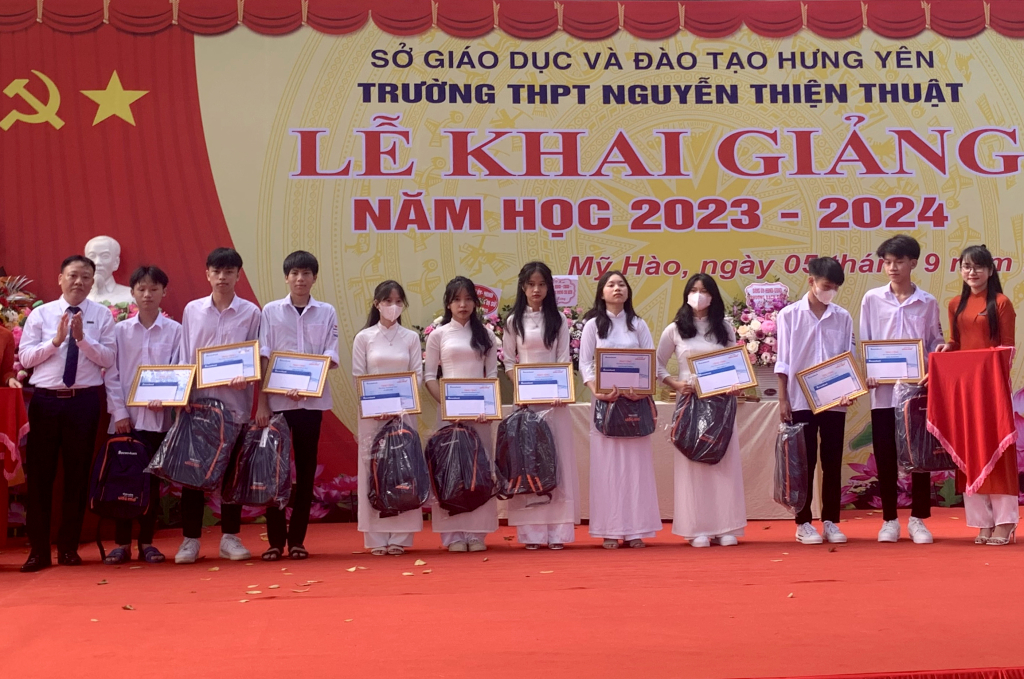 Ông Trần Thành Công, Phó Giám đốc Sacombank - Chi nhánh Hưng Yên trao những phần quà ý nghĩa đến các em học sinh có hoàn cảnh khó khăn, vươn lên trong học tập tại Trường THPT Nguyễn Thiện Thuật (thị xã Mỹ Hào)
