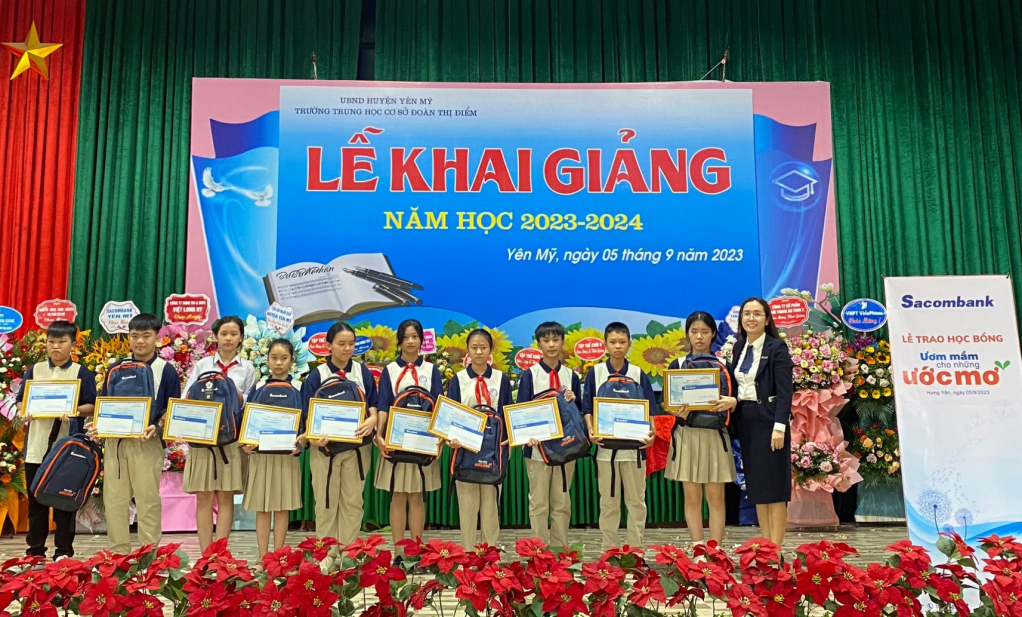 Riêng tại tỉnh Hưng Yên, Sacombank dành tặng tổng số 45 suất học bổng cho học sinh các trường: THPT Nguyễn Thiện Thuật – thị xã Mỹ Hào (10 suất), THCS Hòa Phong – thị xã Mỹ Hào (15 suất), THCS Đoàn Thị Điểm – huyện Yên Mỹ (10 suất), THCS Ngọc Long – huyện Yên Mỹ (10 suất), trong đó có 5 em đoạt giải cuộc thi viết “Chắp cánh bay xa”.