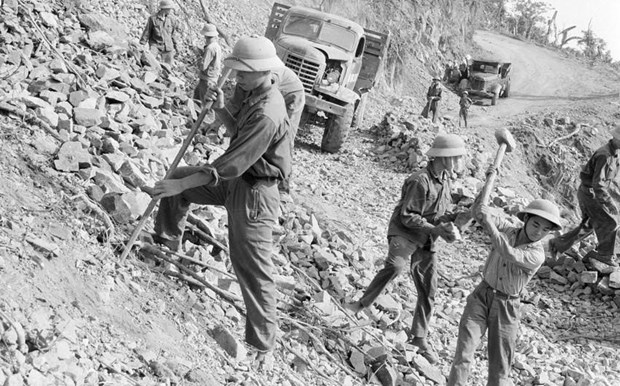Lực lượng Thanh niên Xung phong Trị Thiên mở đường Trường Sơn, nối liền hệ thống giao thông liên tỉnh phục vụ sản xuất và đời sống vùng giải phóng. (Ảnh: TTXVN)