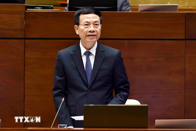 Bộ trưởng Bộ Thông tin và Truyền thông Nguyễn Mạnh Hùng trả lời chất vấn. (Ảnh: Doãn Tấn/TTXVN)