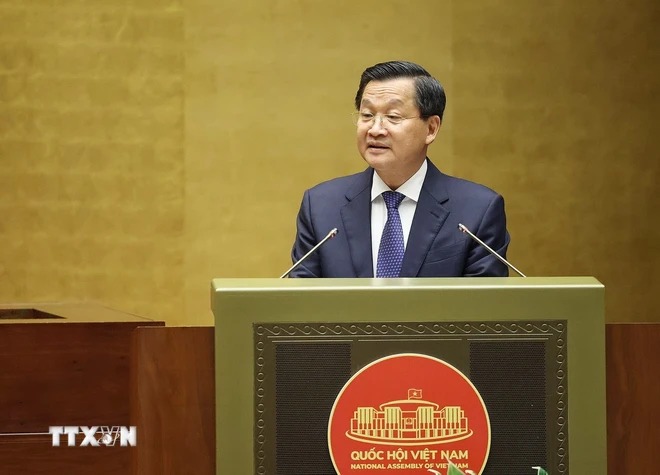 Phó Thủ tướng Lê Minh Khái, thừa ủy quyền của Thủ tướng Chính phủ trình bày Báo cáo đánh giá bổ sung kết quả thực hiện kế hoạch phát triển kinh tế-xã hội và ngân sách nhà nước năm 2023; tình hình thực hiện kế hoạch phát triển kinh tế-xã hội và ngân sách nhà nước những tháng đầu năm 2024. (Ảnh: TTXVN)